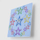 As estrelas são descritas em cores 3D (vermelho, verde, azul, roxo, amarelo). Cinco estrelas pequenas em todas as cores em cada canto. Grande estrela azul no centro, vermelha, amarela, roxa e verde nas posições 9, 3, 6 e 12. O fundo é azul pálido.
