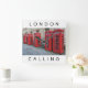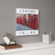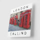 Uma bela fotografia de algumas das famosas caixas vermelhas encontradas em Londres, no Reino Unido, e as palavras "Londres chamando" impressas num relógio de parede quadrada.