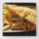Uma fotografia de Fecho de Peixes e Chips impressa em um relógio de parede quadrada.