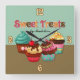 Cupcake com um fundo dividido em lacre e marrom, três cupcakes deliciosos e coloridos. Colorido texto gráfico "Doce Tratações", esboçava os números do relógio. O texto é "por Madeline. Este relógio é totalmente personalizável. Personalize este relógio do cupcake substituindo/removendo o texto do exemplo e/ou quaisquer elementos.