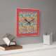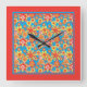 Um relógio de parede quadrado, com um padrão alegre de flores vermelhas, laranja e amarelas em um fundo turquesa brilhante, de uma colagem de papel pintada a mão por Judy Adamson.