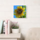 O girassol amarelo floresce no cheio com folhas verdes e céu azul no fundo. Os algarismos brancos têm uma sombra de queda que lhes permite destacar-se na imagem.