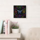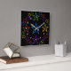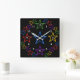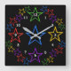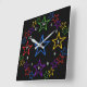 As estrelas são descritas em cores 3D (vermelho, verde, azul, roxo, amarelo). Cinco estrelas pequenas em todas as cores em cada canto. Grande estrela azul no centro, vermelha, amarela, roxa e verde nas posições 9, 3, 6 e 12. O fundo é preto.