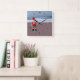 Papais noeis gostando de um dia ensolarado na praia Boneca crochetada com calções tintos, t-shirt vermelha com design de peixe branco, boné vermelho, óculos de sol. Papais noeis caminham sobre a areia, com ondas quebrando para trás. Numerais com aspecto metálico.