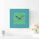 Um relógio de parede quadrado, com uma mistura de "luas azuis" "não combinam padrões de Chevrons e Bolinhas em Azul Dazzling, Neon Verde, Turquoise e Emerald Green. Parte da coleção Posh & Painterly 'Blue Moons'; de um design de colagem de papel pintado à mão por Judy Adamson.