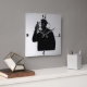 Este relógio de parede mostra uma imagem de um homem robótico com um cabo elétrico conectado na parte de trás da cabeça. O homem ergueu a frente de sua face e a segura na frente dele. Há vários fios coloridos correndo de seu rosto solto para a cavidade frontal vazia de sua cabeça. Uma imagem expressiva e imaginativa criada pelo meu filho, David Mann.