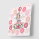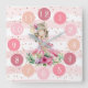 Uma bailarina de aquarela adorável olhando para você com flores delicadas acima da cabeça dela. As horas do relógio estão em cores diferentes que você pode alterar clicando para personalizar ainda mais. O fundo tem listras brancas e cor-de-rosa pastel e pontos brilhantes do ouro.