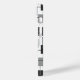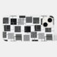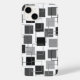 Essa capa de telefone tem um design geométrico de quadrados em preto e tons de cinza espalhados por seus contornos.
