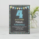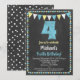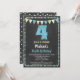 Um convite de 4 anos, azul e amarelo, para o quadro chalkboard, com texto chunky no topo, com fundo chalkboard, bandeiras e uma bela borda poka-dot.