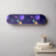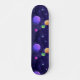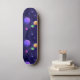 Ilustração de desenho animado de uma cena espacial com planetas, estrelas e cometas, colocada sobre um fundo azul escuro. Os planetas são representados em várias cores, incluindo roxo, amarelo, verde e azul, cada um com texturas e detalhes únicos. As estrelas são pequenas e brancas, espalhadas por toda a cena, enquanto os cometas deixam rastros de luz à medida que atravessam o céu. O estilo geral é caprichoso e lúdico, com foco em cores brilhantes e formas simples. A ilustração destina-se provavelmente a crianças ou a pessoas que desfrutam da arte moderada do tema espacial. Arte digital.