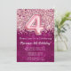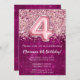 4.º Aniversário Convite Girly Magenta e Pink Glitter 4.º convite de festas de aniversário para uma menina de 4 anos com escrevendo moderno de escrita e balões de folha de papel divertidos.