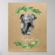 Impressão de elefante doce, perfeitamente neutra com um fundo marrom kraft, folhagens em aquarela e texto em caligrafia branca.