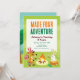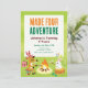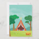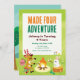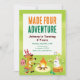 Fez Quatro Aventuras. O Quarto Aniversário Acampou O Convite De Aniversário. Bonito coelho e ilustração de veados a assar-se sobre uma fogueira. Fundo verde e branco. Perfeito para sua aventura ao ar livre, amando quatro anos.