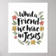 Design de tipografia da Caligrafia moderna em letras negras com sotaques florais coloridos com citação, "Que Amigo temos em Jesus." Palavras são de um adorado título de hino gospel.
