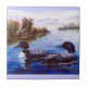 De uma pintura a óleo original por Brenda Thour de um par de mergulhões-do-norte em um lago durante um por do sol de azuis bonitos e de roxos. Original vendido para um leilão da caridade. Copyright por Brenda Thour 2004.