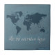 Que a aventura comece o design de texto com a decoração do mapa mundial sobre fundo azul e verde
