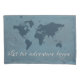 Que a aventura comece o design de texto com a decoração do mapa mundial sobre fundo azul e verde
