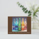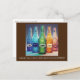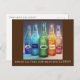 Este cartão-postal contém garrafas coloridas com rótulos que leem alegria, paz, risos, raiva e amor; a redação final declara: "Esqueça tudo isso; que tal apenas café?".