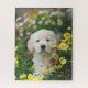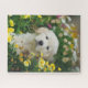 um quebra-cabeça adorável com uma imagem de um filhote num jardim floral.