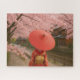This beautiful jigsaw puzzle captures a serene scene of a maiko strolling under fully bloomed cherry blossoms with a vibrant red parasol.