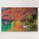 A graceful white swan glides through an emerald green pond, its surface reflecting the fiery colors of autumn. Beneath the calm water, vibrant koi add a touch of elegance and life. This puzzle is a meditative journey through stillness and seasonal beauty — perfect for nature lovers and those who appreciate Japan’s subtle harmony. Optional space available for a custom message.