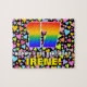 Este design de quebra-cabeça de jigsóvia divertida e colorida apresenta um grande número "17", tendo um padrão de gradação inspirado no espectro multicolor do arco-íris. Também apresenta a mensagem "FELIZ 17º ANIVERSÁRIO" e um nome de destinatário editável. O fundo tem um padrão alegre de formas cardíacas amorosas com várias cores e tamanhos. Um quebra-cabeça de aniversário ousado e personalizado como este pode ser uma maneira divertida de enviar cartões de aniversários a alguém que comemora seu 17º aniversário. [~Z0000611]