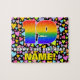 Esta design de quebra-cabeça de jigsóvia ousada e empolgante apresenta um grande número "19" com um padrão de gradação inspirado no espectro multicolorido do arco-íris, juntamente com a mensagem "FELIZ 19º ANIVERSÁRIO", e um nome de destinatário personalizado. O fundo apresenta um padrão alegre de corações amorosos de várias cores e tamanhos. Um quebra-cabeça de aniversário divertido e personalizado como este pode ser dado em comemoração do décimo nono aniversário de alguém. [~Z0000611]