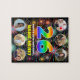 Esta divertida e empolgante design de quebra-cabeça de quebra-cabeça com tema de aniversário apresenta um grande número "26" com um espectro multicolorido de arco-íris inspirado em gradiente, juntamente com a mensagem "FELIZ 26º ANIVERSÁRIO", e um nome personalizado, num padrão inspirado por fogos de artifício celebratórios multicoloridos. As imagens perto de cima e de baixo podem ser personalizadas. talvez com fotos do receptor e/ou da família e amigos do destinatário. Um quebra-cabeça de quebra-cabeça de aniversário alegre e personalizável como este pode ser enviado para celebrar o vigésimo sexto aniversário de alguém. (Fotografia © Storytree Studios, Stanford, CA.) [~Z0000664]