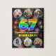 Este design de quebra-cabeça de quebra-cabeça, tema de aniversário, otimista e divertido, apresenta o número "67", tendo um espectro de arco-íris vibrante inspirado em um padrão de gradiente, junto com a mensagem "FELIZ 67.º ANIVERSÁRIO" e um nome personalizável, em um padrão inspirado em fogos de artifício multicoloridos e celebratórios. As imagens perto de cima e de baixo podem ser personalizadas. talvez com fotos do receptor e/ou da família e amigos do destinatário. Um quebra-cabeça de quebra-cabeça divertido e personalizável como este pode ser uma maneira divertida de entregar cartões de aniversários a alguém que está celebrando seu sexagésimo sétimo aniversário. (Fotografia © Storytree Studios, Stanford, CA.) [~Z0000664]