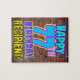 Este design de aniversário divertido apresenta a mensagem "FELIZ 77º ANIVERSÁRIO", tendo uma vibrante, colorida arte urbana de rua e grafite inspirada, junto com um nome de destinatário editável. O plano de fundo apresenta um padrão inspirado pela aparência de uma parede de tijolos. Um quebra-cabeça de aniversário divertido e personalizável como este pode ser usado para celebrar o setenta e sete anos de alguém. [~Z0000532]