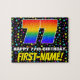Este vibrante e alegre design de quebra-cabeça de aniversário apresenta um grande número de "77" com um padrão de gradação inspirado no espectro multicolor do arco-íris. Também apresenta a mensagem "FELIZ 77º ANIVERSÁRIO" e um nome de destinatário editável. O fundo tem um padrão de estrelas coloridas e otimista. Um quebra-cabeça de aniversário personalizado e atraente como este pode ser usado para reconhecer o setenta e sete anos de alguém. [~Z0000607]
