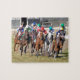 O grande momento da corrida de cavalos em que os puro-sangue transformam na parte superior do estiramento no relvado. Esta opinião principal dúzia cavalos de corrida, com seus músculos rippling luta ao meta nos narizes de um revestimento da foto distante na competência histórica e no casino de Parx para o corredor das estacas anuais da sopa do alfabeto na grama. Javier Castellano no trilho, com as sedas amarelas do boné e dos azuis marinhos, vai fio a prender com relatório primeira-mão, o único potro na raça.