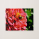 Belo Dia de Verão! Bonito zinnia de coral laranja com um pequeno abelhinho. Foto de H Cooper. O texto é personalizável!