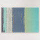 Um design quebra-cabeça, divertido e colorido. As abstrato do azul-oceano, do aqua e do chocolate complementam as areias prateadas e o glorioso pôr do sol.