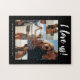 Moderno preto e branco "Eu amo-nos", quebra-cabeça de colagem de fotos com script de pincel, com nome personalizado e ano.
