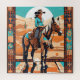 Um retrato de uma mulher em um cavalo com um fundo desértico e uma fronteira abstrato. Criado com a ajuda da IA de um design original meu.