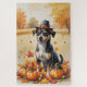 Uma pintura em forma de aquarela de um cão alegre sentado em meio a uma pilha de folhas vibrantes de queda, cercado por pequenas abóboras e bolotas espalhadas. O cachorro veste um chapéu de peregrino e fede de alegria, capturando o espírito da Ação de Graças. No fundo, campos de colheita suaves e árvores abrigadas em ouro criam um ambiente rural pacífico. Texturas gentis e tons de outono aquecidos dão à cena uma sensação acolhedora e nostálgica de celebrar a beleza da estação.