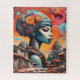 Esta trabalho de arte é uma representação vibrante e surrealista de uma figura que combina elementos africanos tradicionais com uma estética ousada e futurista. A figura central é uma mulher com pele azul, o que lhe dá uma presença quase etérea ou de outro mundo. Sua expressão é serena, com grandes olhos expressivos e lábios de cheio. O cabelo dela é uma explosão de formas abstrato que se assemelham a nuvens coloridas e a curvas intrincadas, sugerindo criatividade, pensamento, ou possivelmente um símbolo coroa de sabedoria e imaginação. As matizes vívidas — que vão de pintas, azuis, laranjas e vermelhos — trazem a composição à vida e evocam um senso de energia e vibração. O fundo apresenta uma cena abstraída de uma aldeia africana, com casas modernizadas, mas rústicas, misturadas com formas orgânicas como sonhos. O céu passa de um azul calmante para tons mais quentes, oferecendo um sentido de paz e dinamismo, como se a cena existisse entre dois mundos — talvez o real e o imaginado, ou o passado e o futuro. Este trabalho parece simbolizar a fusão do patrimônio africano com uma visão ousada do futuro. O véu e adornos da mulher representam a beleza tradicional africana, enquanto as cores e elementos surreais apontam para o espírito inovador e imaginativo. A imagem pode ser vista como uma celebração da cultura, identidade e resiliência africanas, expressa através de uma mistura de tradição e criatividade virada para o futuro.
