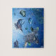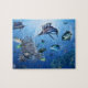 Uma agitação de peixes do Sailfish, do golfinho, de atum e de tubarões ataca uma bola apavorada de peixes pequenos da isca nas águas tropicais azuis profundas claras. O artista australiano conhecido, o entusiasta marinho e o pescador afiado Cade capturaram cuidadosa a toda a ação e emoção deste banquete subaquático frenético em uma escala épico e estão agora disponíveis como um quebra-cabeça!