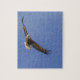 Uma águia-careca adulta numa curva afiada, realçada por um céu azul.