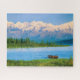 Wonder Lake, alce macho se alimenta de vegetação, montanhas do Alasca ao fundo, Parque Nacional Denali, Alasca