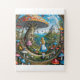 Nessa vibrante e fantástica cena, Alice está na frente vestida de roupa azul e branca, olhando em direção a um mundo mágico. A paisagem branca apresenta casas em forma de cogumelo, um castelo, cogumelos, flores, borboletas e coelhos. As cores são ricas e imersivas, criando uma atmosfera de conto de fadas encantadora.