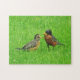 Young robin deixou o ninho, mas ainda precisa de atenção da mamãe.