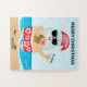 Meninos temáticos havaianos quebra-cabeça de natal apresenta Papais noeis em uma praia tropical vestindo shorts de impressão de hibisco vermelho e branco, tomando um abacaxi. Os cartões de natal (mostrados aqui com Feliz Natal e Aloha) e o nome podem ser personalizados para um presente de feriado único. Trabalho de arte original do KL Stock.