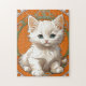 Quebra-cabeça com um gatinho branco no estilo Art Nouveau de Alphonse Mucha! Um belo gatinho com olhos azuis piercing olha para o espectador. Círculos geométricos laranja com folhas verdes e lattice branca rodeiam o gatinho. Um presente perfeito para amantes de gatos e colecionadores de Art Nouveau!