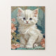 Quebra-cabeça com um gato branco no estilo de Alphonse Mucha! Este gatinho liso e de olhos azuis posou com flores cor-de-rosa e cobertores azuis. Um presente fabuloso para amantes de gatos e colecionadores de Art Nouveau!