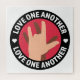 Duas mãos (cor de pêssego e castanho) dizendo "Eu te amo" contra um fundo cor-de-rosa escuro dentro um círculo preto com texto branco em cima e em baixo dizendo "Ame um ao Outro".