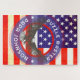A unique antique style American stars and stripes flag with eagle ink overlay hand drawing custom jigsaw in red, white and blue hues. Personalize with your own choice of name and slogan, current example reads Puzzle Master, Papa Johnson. Original design and eagle bird of prey inked line art created by hand by Sarah Trett.