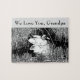Seu avô ama um desafio? Veja esta quebra-cabeça com uma foto em preto e branco de um pato sentado na água de um lago. Este pato-grande está aninhado nas sementes e tanto o reflexo do pato como o do pinto podem ser vistos na água. Uma faixa de cinza leve no topo fornece uma faixa sólida para "Nós te amamos, vovô" que pode ser personalizada fácil e rapidamente.