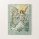 pintura de safra em pastéis com um anjo em vestido azul claro e segurando flores.